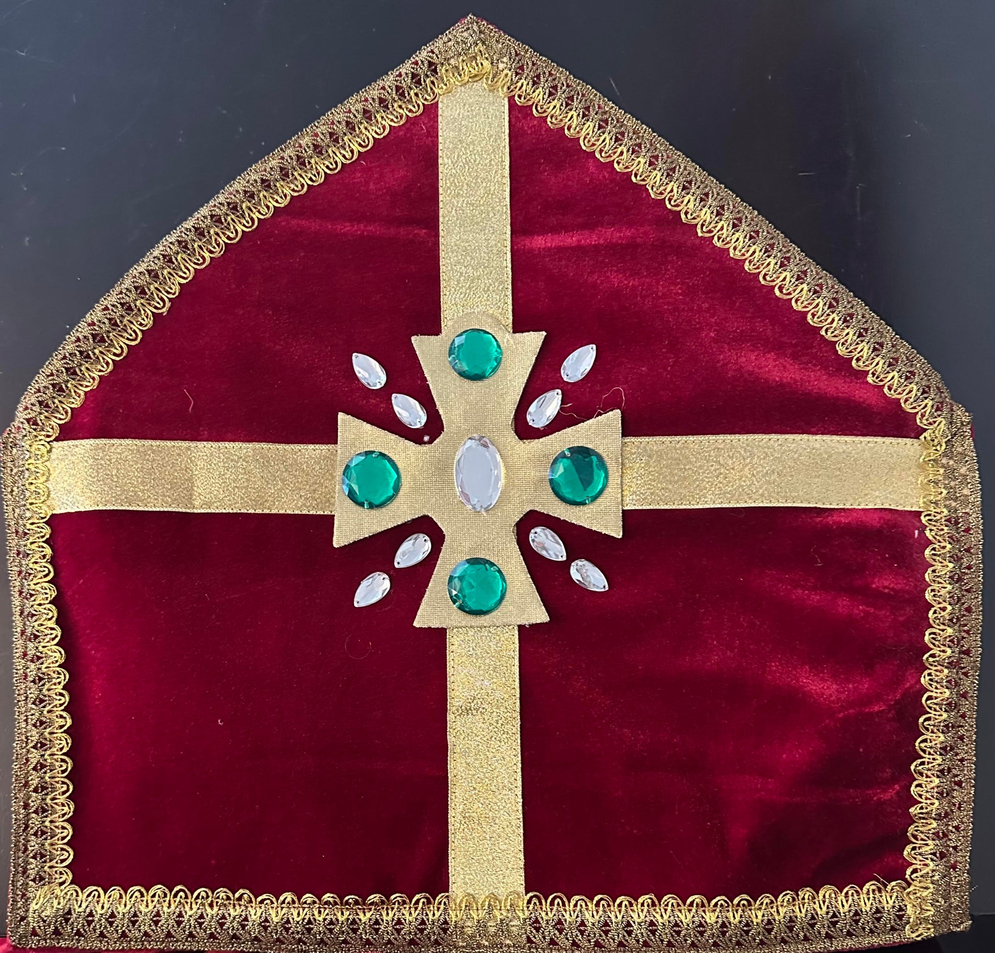 - The scarf and hat are made of rich burgundy velvet, decorated with gold trims, fringe, handmade gold crosses, and colorful crystal stones, each one painstakingly glued by hand for added elegance.
