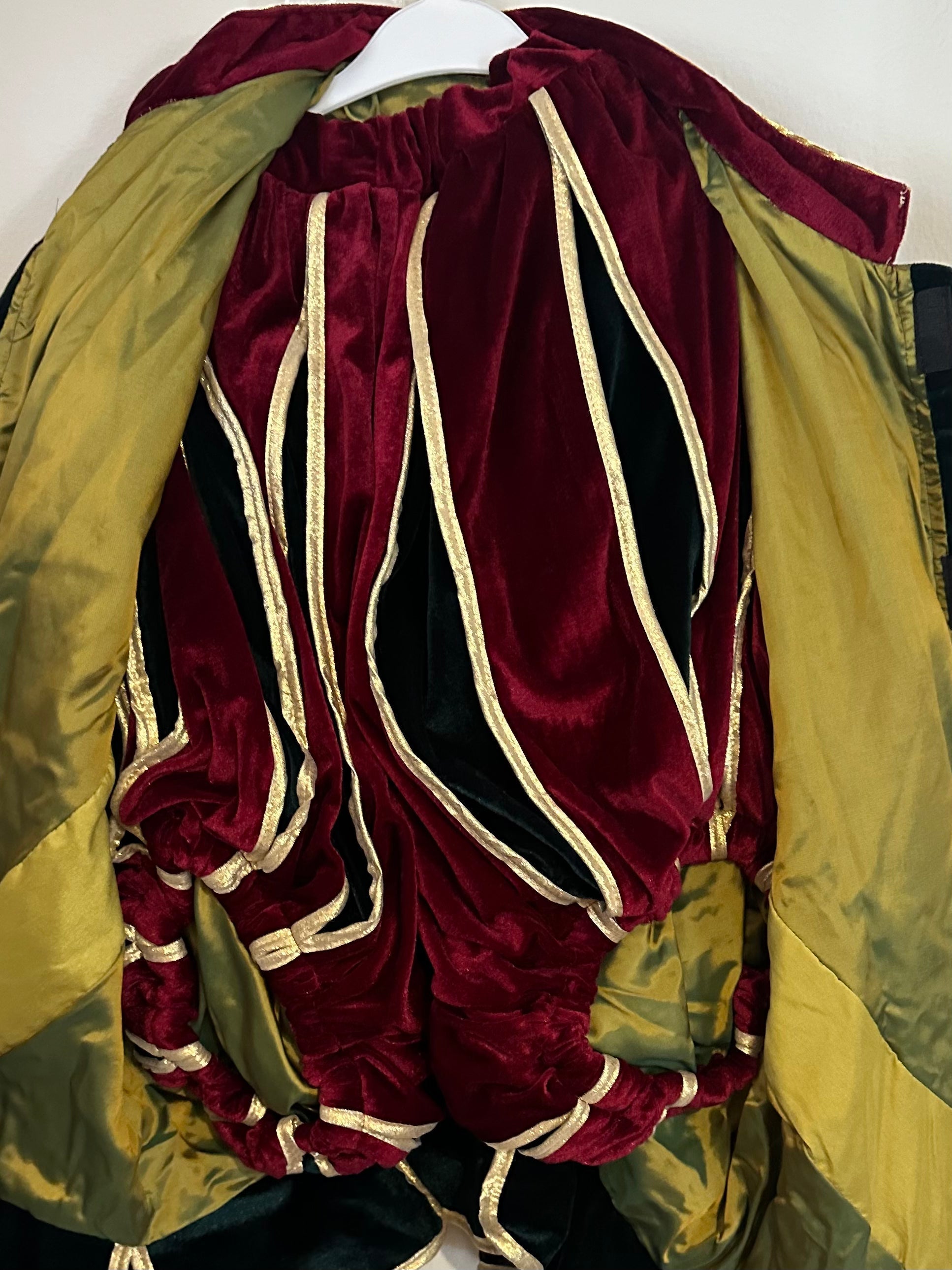 The jacket fastens with Velcro at the front and is adorned with large, colorful gemstone buttons for a striking look. The trousers, or hose, are made from a combination of slashed red and green velvet, with the openings trimmed in more golden braid for added elegance. Both the waistline and the cuffs at the legs are elasticated to ensure a comfortable fit.